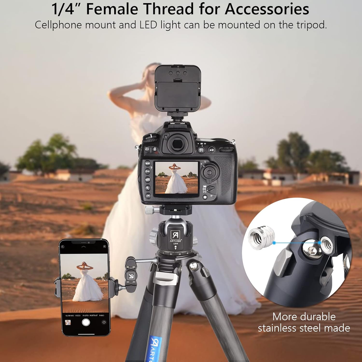 【Super Stable Carbon Fiber Tripod】: The carbon fiber travel camera tripod is made of top-notch carbon material and craftsmanship. It is made of 10-layer carbon fiber leg tubes and aluminum alloy material, which is firm and stable, the leg diameter of the tripod is 32.5mm-29mm-25.5mm-22mm to ensure that the Max load 44 lbs /20 kg, Tripod Net Weight: 3.68 lb/1.67kg, Using Height from 4.72in/12cm to 63.4in/161cm