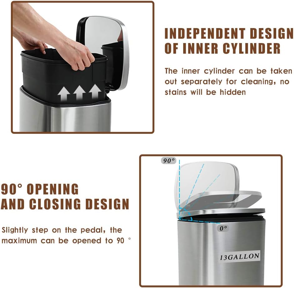 Feature: The surface treatment of stainless steel wire drawing makes it easier for you to clean the kitchen trash can an keep it clean all the time. Just tap on the pedal with your toes and you can open the lid. When you release your toes, the lid will fall slowly. Our garbage can has 13 gallon's super capacity, no longer frequent garbage dumping, to meet daily needs, basically just once a day. Suitable for all kinds of occasions, kitchen, bedroom, living room, because our stainless steel trash can is convenient and practical, so as long as you can think of anywhere you can use. Material: Stainless steel and pp Capacity:13 gallon Size:16.6*11.4*25.5 inch Weights:14 pounds