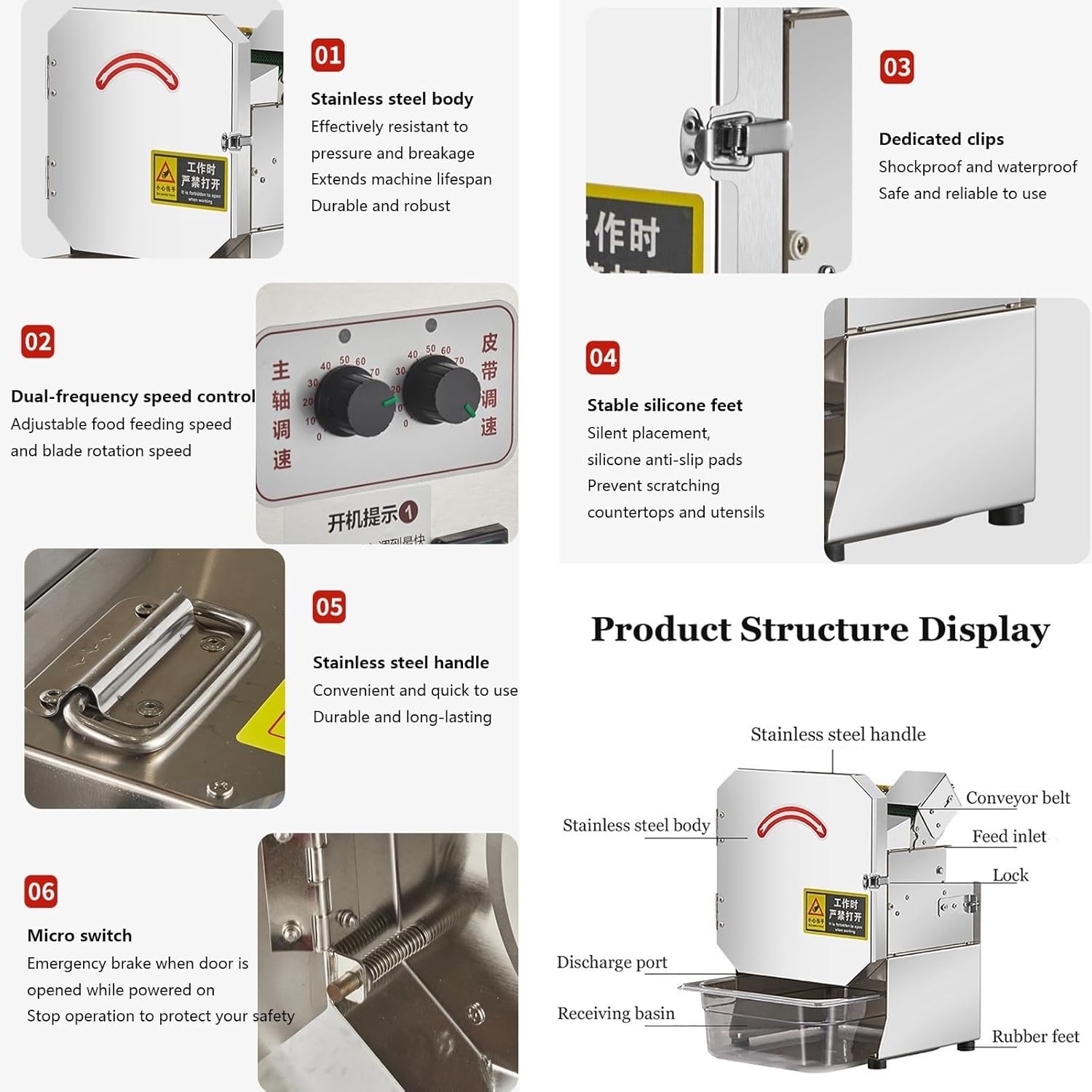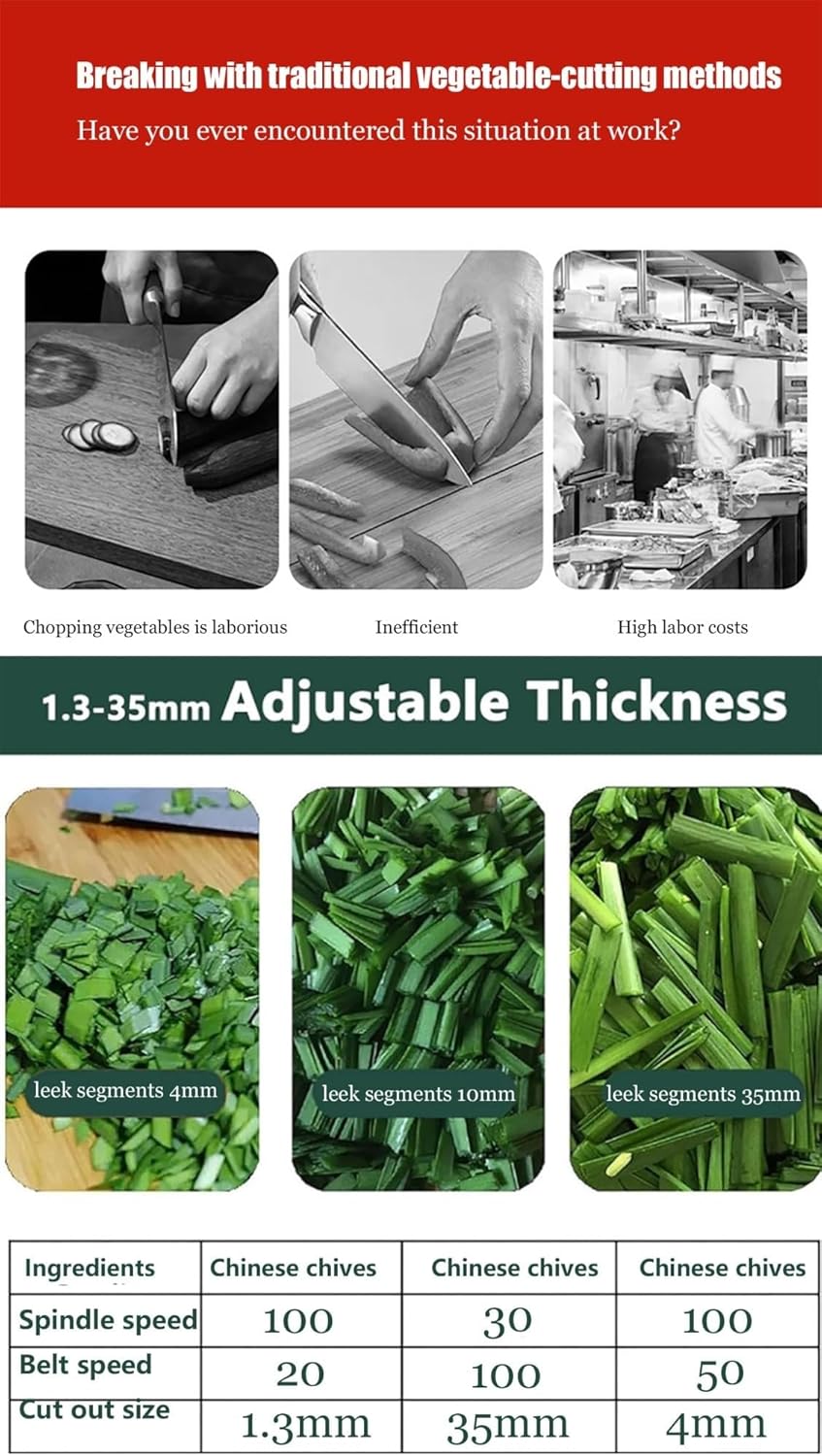 Tired of tedious costly vegetable prepStruggling with uneven cuts and slow preparation in your commercial kitchen Our automatic vegetable cutter is the smart solution that ends manual labor and boosts efficiencyWhy Choose Our Vegetable CutterUnmatched EfficiencyHigh Output Process 150 to 300 kg of vegetables per hour ideal for continuous operationRapid Mode Switching Change between slicing dicing and shredding in just 3 secondsWide Feed Port 70 mm belt opening supports automatic and bulk feedingPrecision and FlexibilityFully Adjustable Easily control slice thickness and cutting length from 15 to 35 mmThree Blade System Mimics manual cutting without water loss preserves freshness texture and tasteBuilt for Commercial UseDurable Construction Made of food grade 304 stainless steel corrosion resistant and easy to cleanCompact and Sturdy Dimensions 28x26x38 cm net weight 87 kg fits smoothly into any kitchen layoutTechnical SpecificationsPower 200WVoltage 110V or 220V Dual VoltageMotor Speed 700 RPMFunctions Slicing Dicing Sectioning ShreddingIncluded Main Machine Receiver Tray Small Brush Allen Key User ManualUsage and Care TipsAlways unplug before cleaning or maintenanceClean blades and conveyor belt after each useDo not process frozen foods bones or extremely hard ingredientsUse warm water 60 to 80C for effective belt cleaningCustomer SupportHave questions or need help Our team is here to assist you within 24 hoursUpgrade your kitchen today save time cut costs and serve perfectly prepared vegetables every time