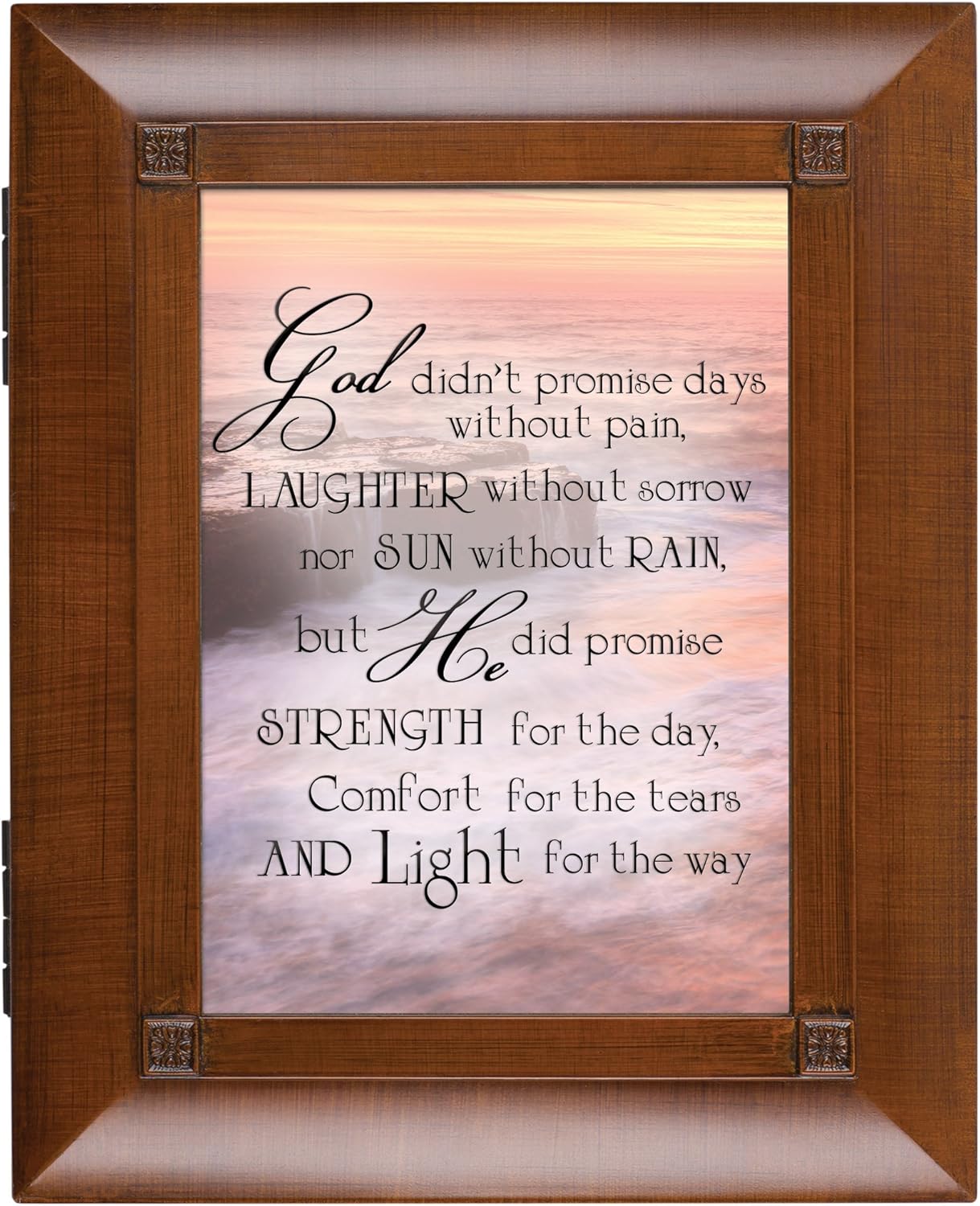 Cottage Garden inspirational and sentimental products are both lovely and classic in style. Be encouraged by a message that reads, "God didn't promise days without pain, laughter without sorrow nor sun without rain, but he did promise strength for the day, comfort for the tears and light for the way." Designed by artists in the Heartland of America, Cottage Garden’s Collections reach a variety of tastes and have a wide range of occasions for gifting. Classic woodgrain finish and architectural rosette details give this remembrance box timeless charm. Measures approximately 9.5 x 7.5 x 3.5 inches. Artwork can be replaced with a personal 5 x 7 photo. Includes 20 Comfort Cards with the title Remembering When for personal messages. Replace artwork with a personal photo in the hinged lid with a classic woodgrain finish. Ships in protective packaging; Thoughtful gift for bereavement or memorial.