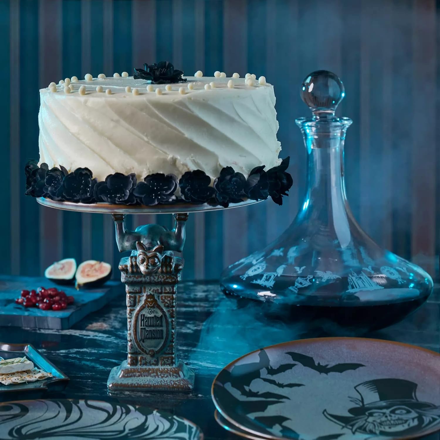Porcelain cake stand Pillar with The Haunted Mansion logo and figural gargoyle on top Plate features The Haunted Mansion wallpaper design