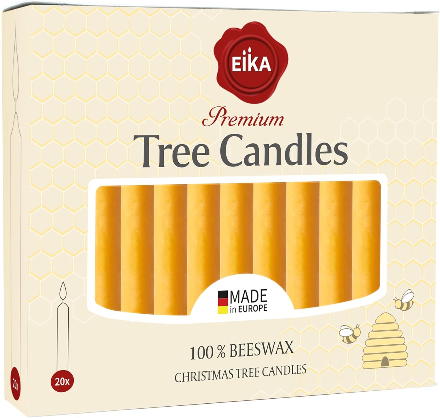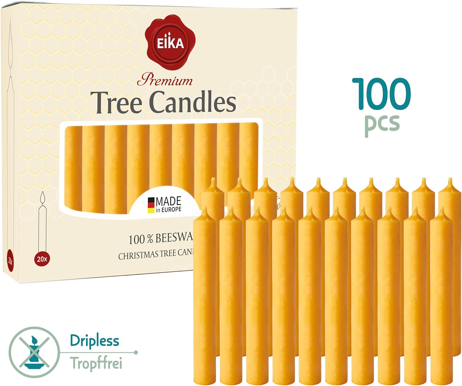 Eika Beeswax Christmas Tree Candles for Pyramids, Chimes - Pack of 100 For Christmas: Celebrating Christmas together with your family is a long tradition and what would this be without the festive atmosphere of burning candles? With a diameter of 0.5 Inch, our candles are the perfect size for your Christmas decorations, angel games, pyramids or candle arches. For birthdays: Whether used as festive party decorations or as classic candles for birthday cakes, these yellow candles have the ideal size and with their outstanding quality they are the right choice for special occasions in your home. For romantic hours: What could be more romantic than time for two at home by flickering candlelight? The candles produce a pleasant, not too bright light and burn odorless and smoke-free. Perfect for an evening on the couch. With matching holders also an atmospheric highlight for the bathroom. For crafting: Create your very own decoration with these candles. Whether table decoration, flower arrangement or room decoration, with these beeswax candles you set beautiful highlights in your very own personal decoration idea. Product details: - Highest quality - Long burning time: 1.5 hours - Clean and smokeless burning - Beeswax for a fine festive fragrance - Made in the EU Dimensions: Height: 3.74 inches (95 mm), diameter: 0.5 inches (12.5 mm). The candles are designed to match your chimes, pyramids or candle arches. Nevertheless, please check the size of your candle holder to make sure they match Available with 10% and 100% beeswax