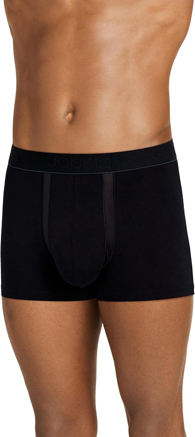 Introducing separation underwear that wraps around and under your anatomy—with no extra walls or chambers. The Jockey Chafe Proof Pouch Cotton Stretch Trunk is the ultimate solution to groin sweat, chafing and those annoying, awkward adjustments caused from shifting. The ergonomically engineered, mesh-lined and vented pouch keeps everything comfortably separated and supported for improved airflow and enhanced moisture wicking. Bend, stretch, run or sit while everything stays in place—with next-to-zero adjustments.