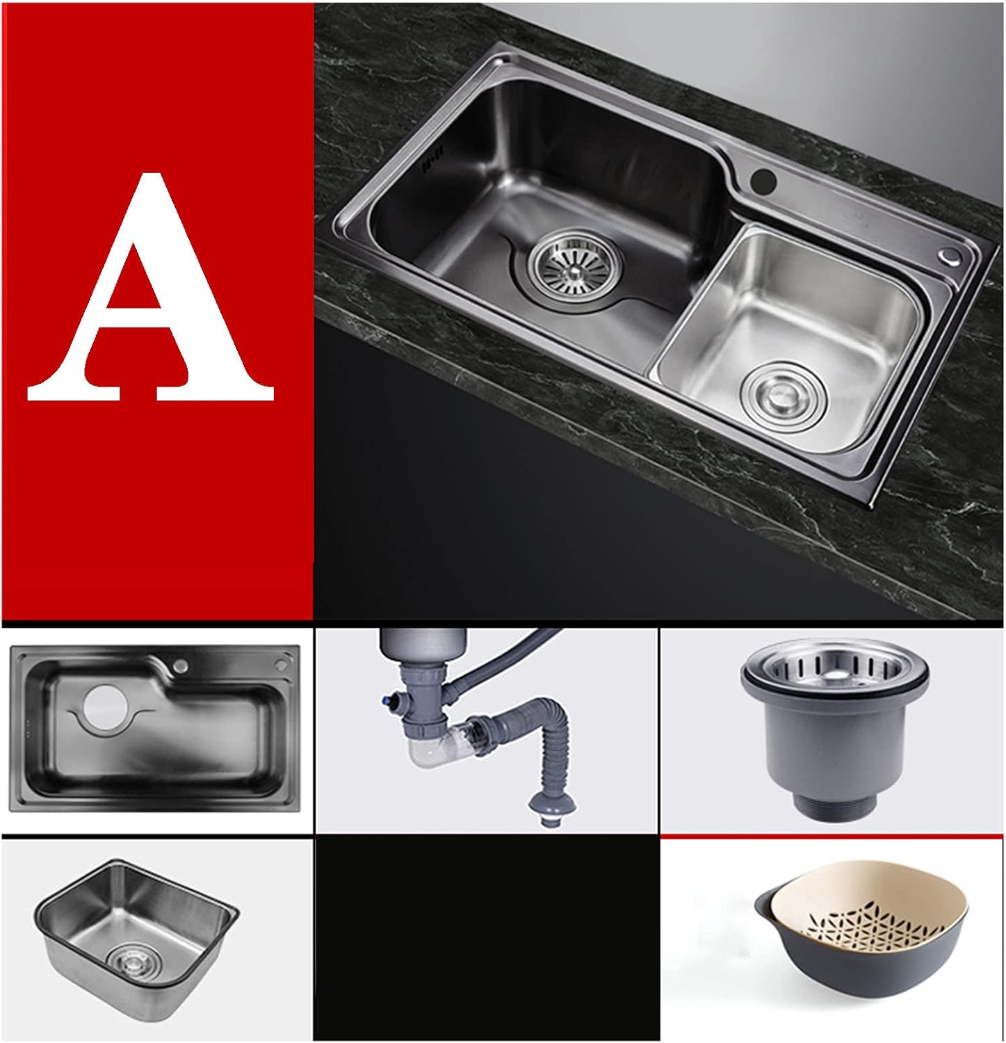 Kitchen 304 stainless steel sink, for daily cleaning, built-in, 2 holes, can be used with water purifiers or soap dispensers, equipped with sound-absorbing bottom layer and thick rubber sound insulation pads, can be used in kitchens, balconies, garages, stainless steel, workbenches Wait. Product name: Kitchen sink Material: Stainless steel shape: rectangle Colour: Black Size:78*45*20cm(30.7*17.7*8 inches) Packing list: A-sink, drain assembly, stainless steel basin, PP drain basket. B--Sink, drain assembly, stainless steel basin, PP drain basket, pull-down faucet, angle valve*2.