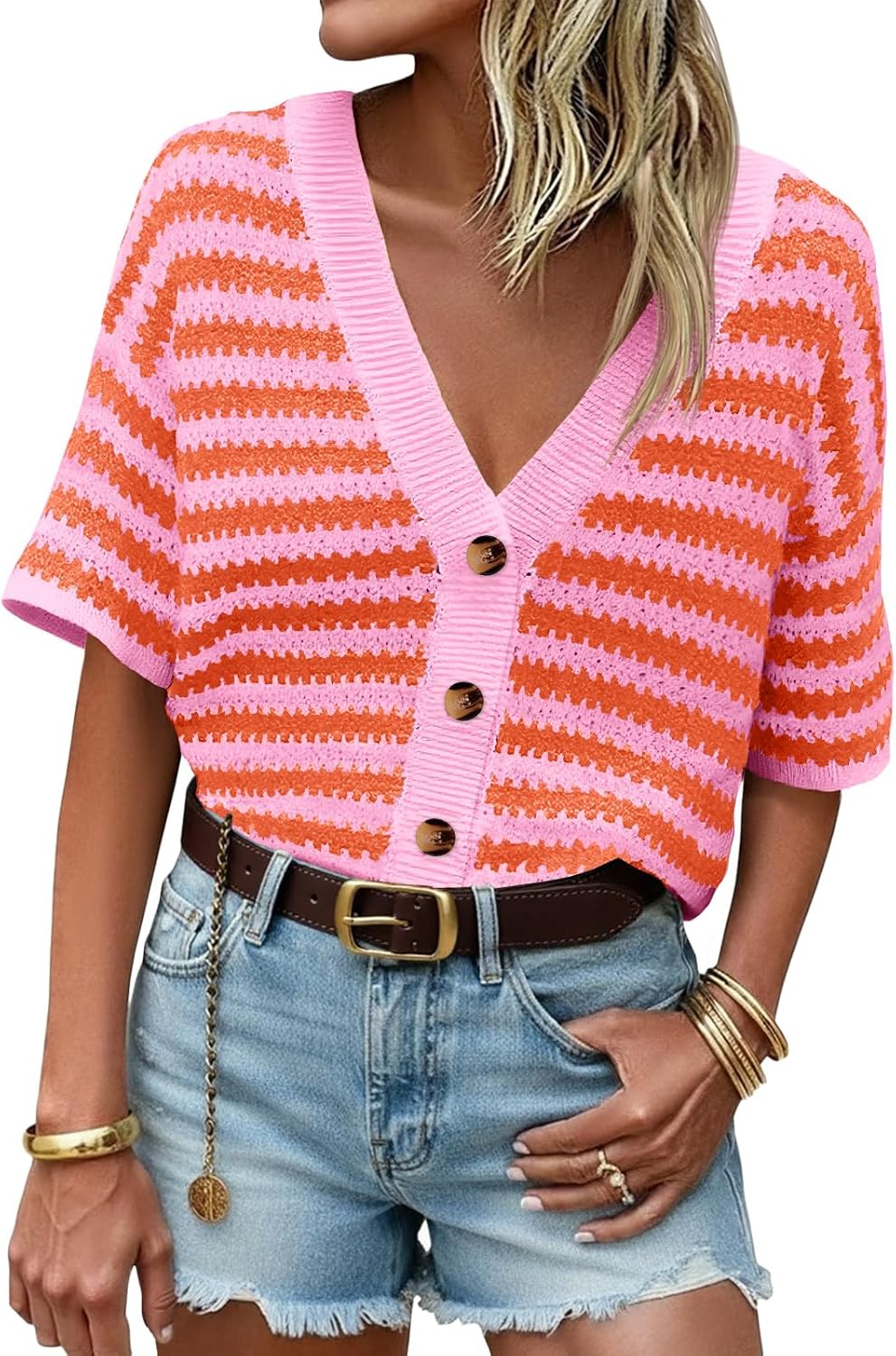 Make a stylish statement with this charming unique striped knit shirts. This short sleeve shirts suits for casual, work, office, street, resort, cruise, beach, vacation, holiday, etc